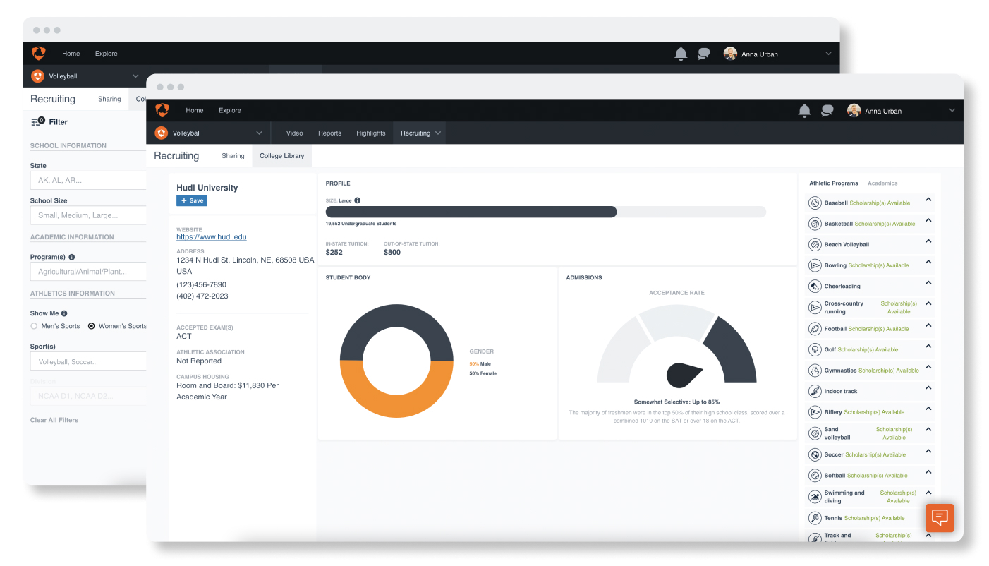Highlight reels from Hudl help capture recruiters attention, but when players opt in to recruiting, recruiters can then see extra information that will help them evaluate a player’s potential. And with Hudl’s college search and contact tools, athletes are empowered to manage their own recruiting journey—including contacting coaches directly.