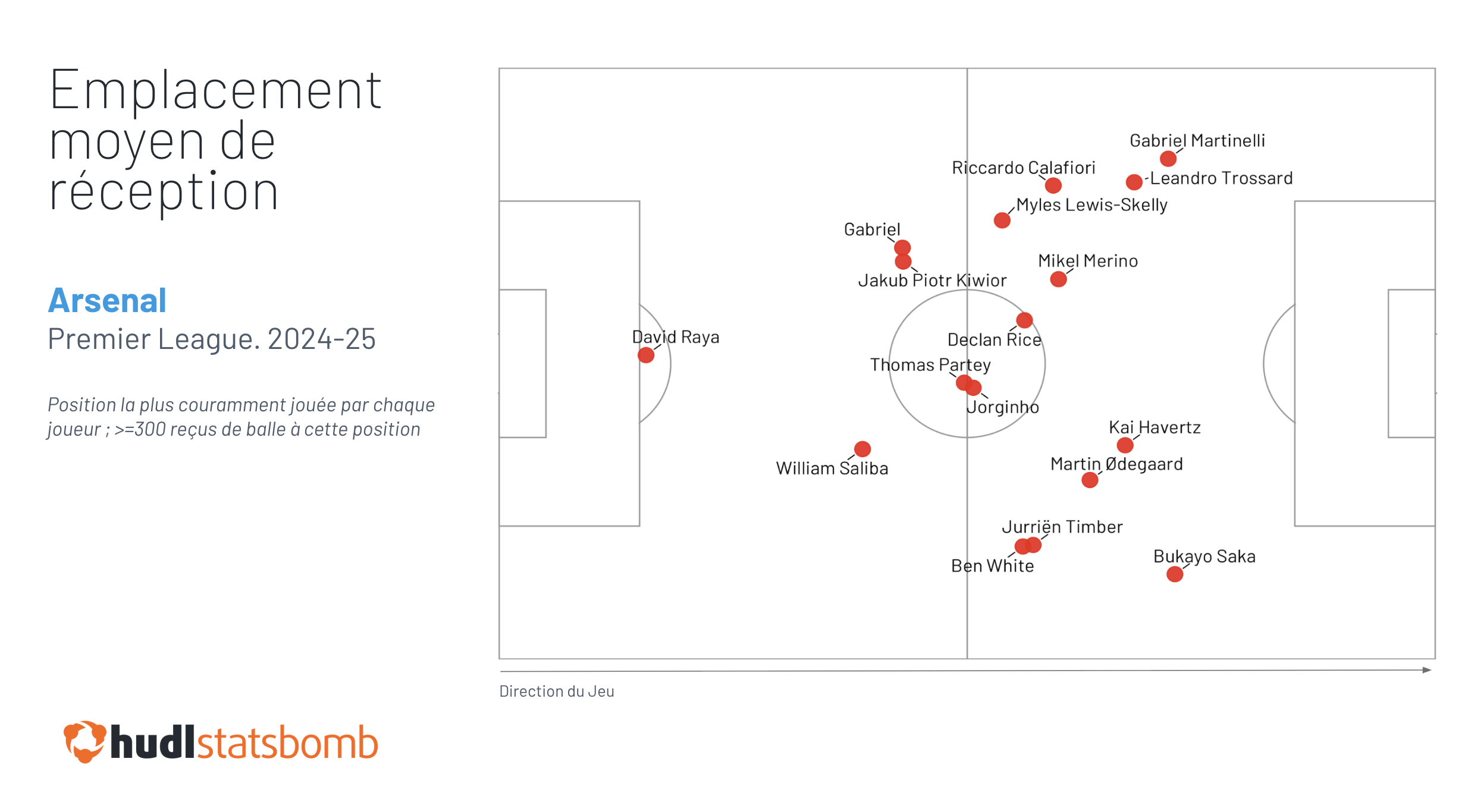 Si nous prenons l'emplacement moyen de réception de balle des joueurs d'Arsenal la saison dernière, en filtrant sur la position que chaque joueur a occupée le plus fréquemment…