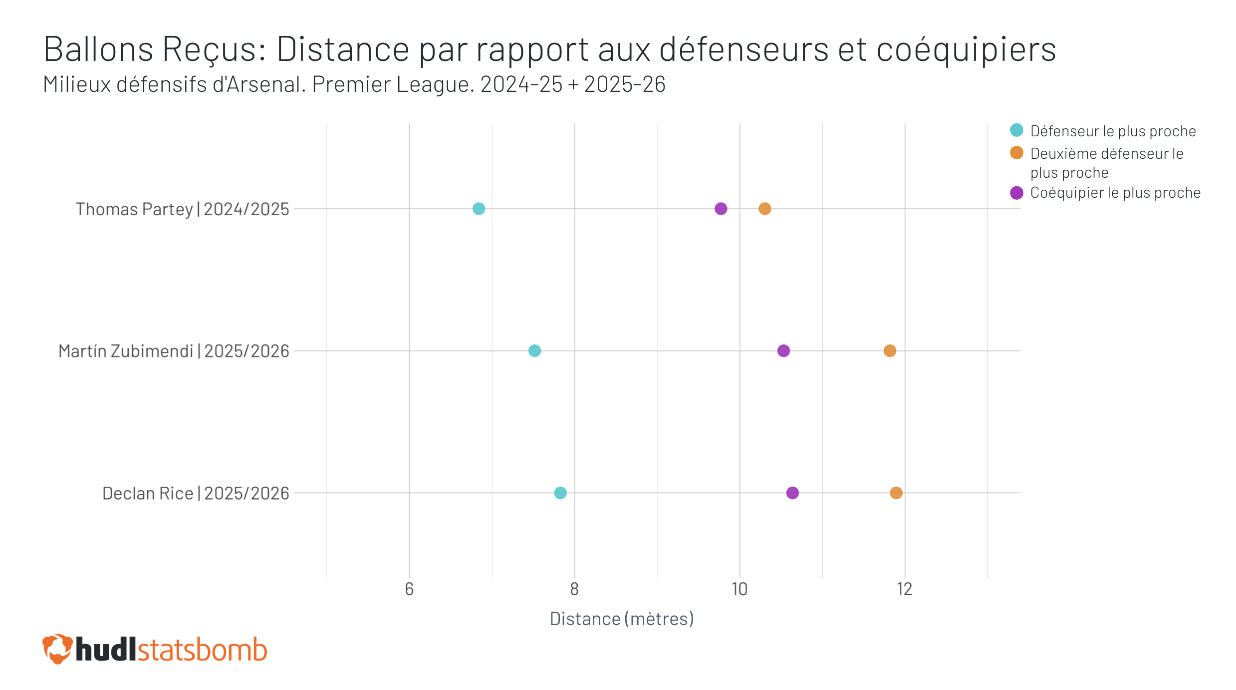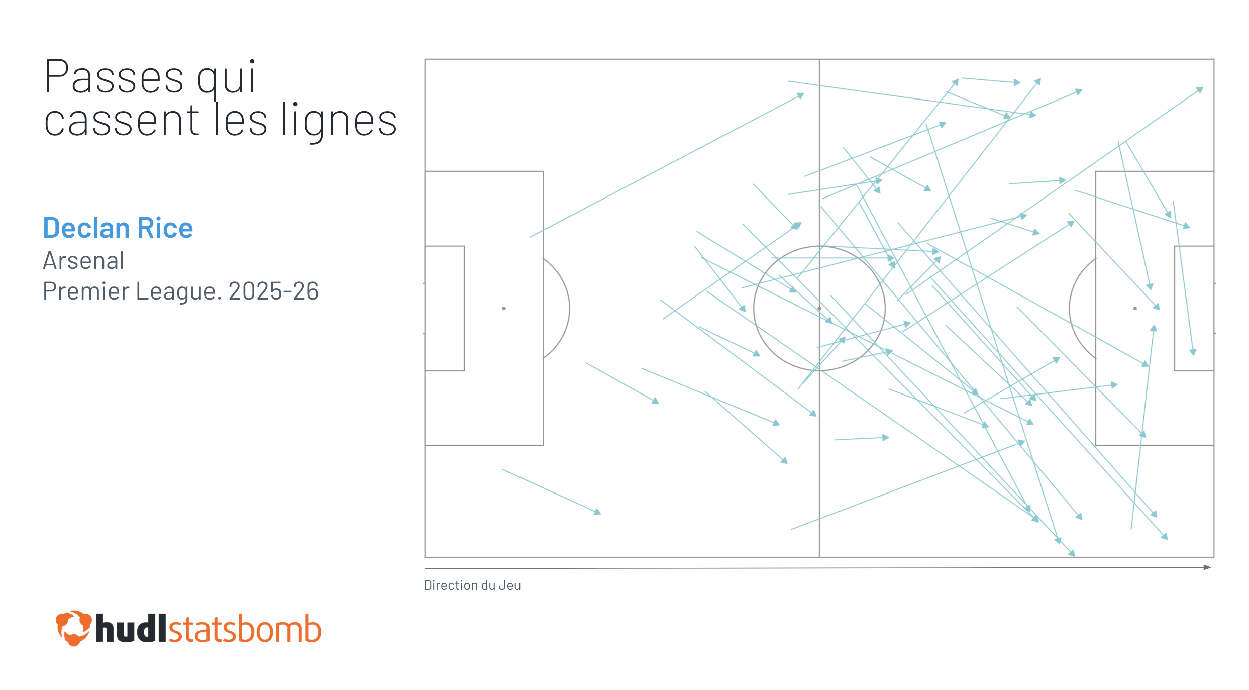 Cette dernière observation correspond à un changement plus large dans son profil de passe. Rice a joué plus d'une longue passe supplémentaire par 90 que lors des deux campagnes précédentes, contribuant à ce que sa longueur moyenne de passe augmente d'environ un mètre. Mais il est intéressant de noter que sous la pression d'un adversaire, sa longueur de passe est restée constante, suggérant davantage que l'espace supplémentaire dont il bénéficie a contribué à sa gamme de passes plus étendue.