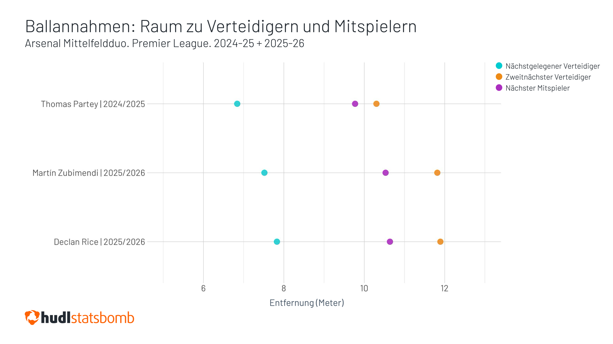 Sie haben nicht nur mehr unmittelbaren Raum, sondern im Durchschnitt sind auch der zweitnächste Verteidiger und ihr nächster Mitspieler weiter entfernt, als sie es letzte Saison von Partey waren. Es ist in der Tat bemerkenswert, dass Rice den Ball selbst in den weniger überfüllten Bereichen des Spielfelds in dieser Saison mit mehr Raum erhält als in den Momenten, in denen er sich letzte Saison dorthin fallen ließ.