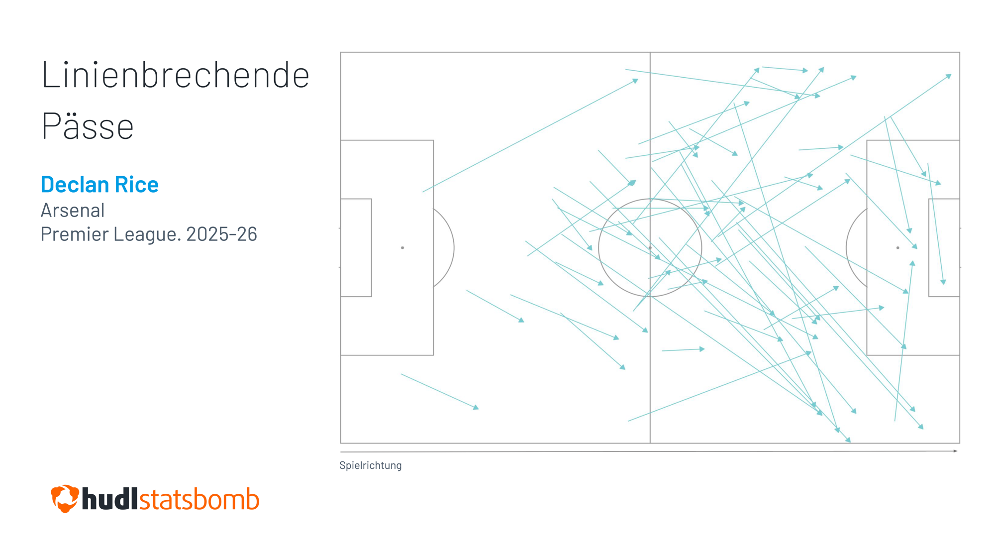 Wie bereits erwähnt, ist Rices persönlicher Beitrag auf 5,31 Linienbrechende Pässe pro 90 gestiegen – eine Steigerung von fast 40 % im Vergleich zur Vorsaison.
