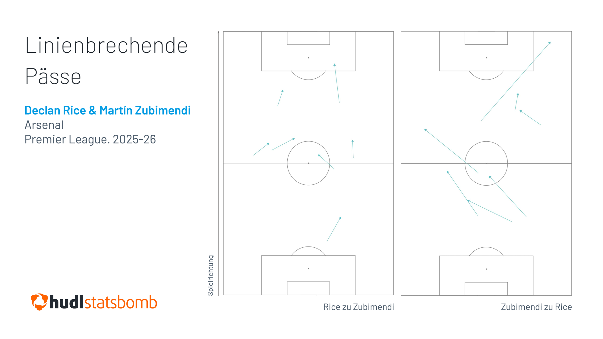 Rice und Zubimendi haben bereits nur fünf Linienbrechende Pässe weniger ausgetauscht (14) als Rice und Partey in der gesamten letzten Saison, und die Aufteilung ist ebenfalls weitaus ausgeglichener. Letzte Saison war Rice primär eine Anspielstation nach vorne für Parteys Pässe und machte 17 der 19 ausgetauschten Linienbrechenden Pässe aus; in dieser Saison haben Rice und Zubimendi sieben Pässe pro Kopf geteilt.
