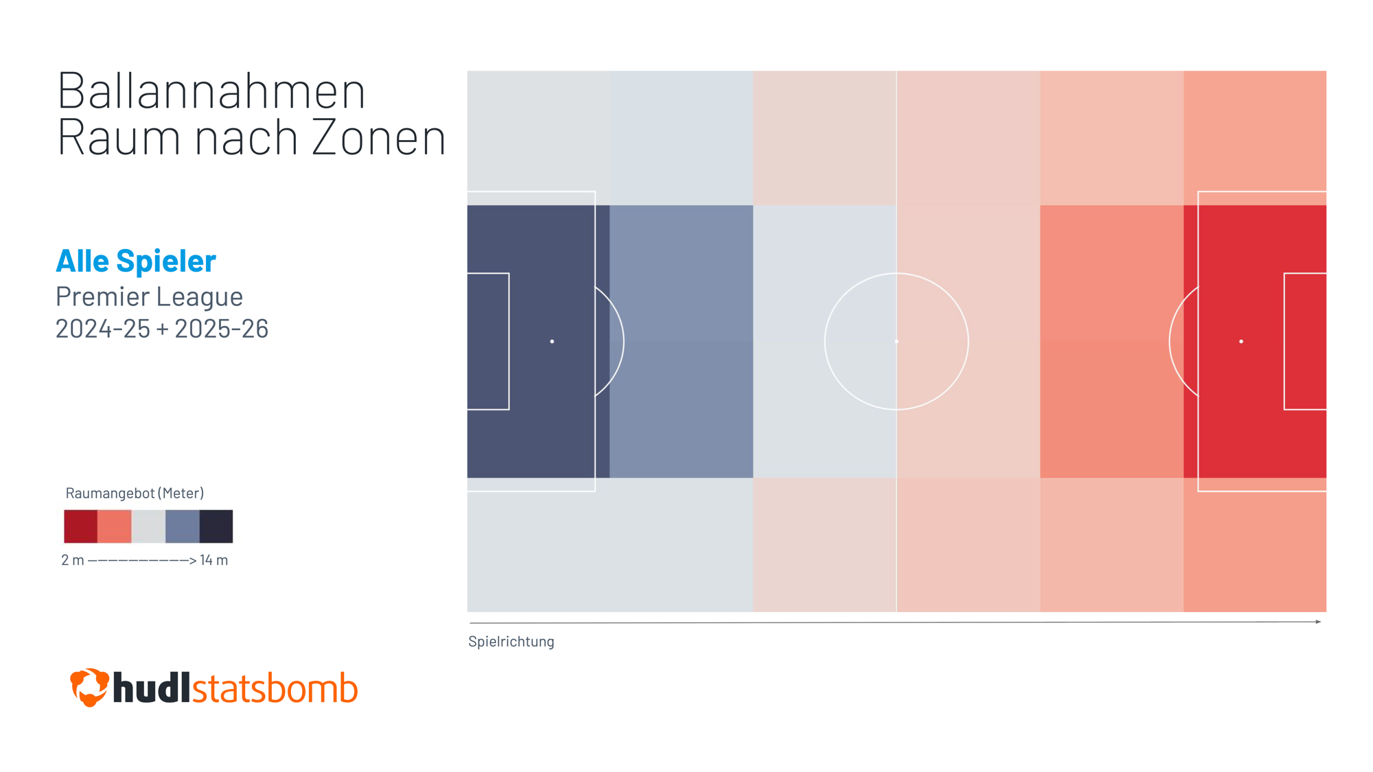 Und wenn wir Rices Ballannahmen von dieser Saison mit denen der letzten Saison vergleichen, ist sofort ersichtlich, dass er den Ball häufiger in jenen Zonen mit größerem Raumangebot erhält. Konzentriert man sich nur auf den zentralen Korridor seiner eigenen Hälfte, ist der prozentuale Anteil seiner gesamten Ballannahmen in dieser Zone von 24 % in der letzten Saison auf 39 % in dieser Spielzeit gestiegen.