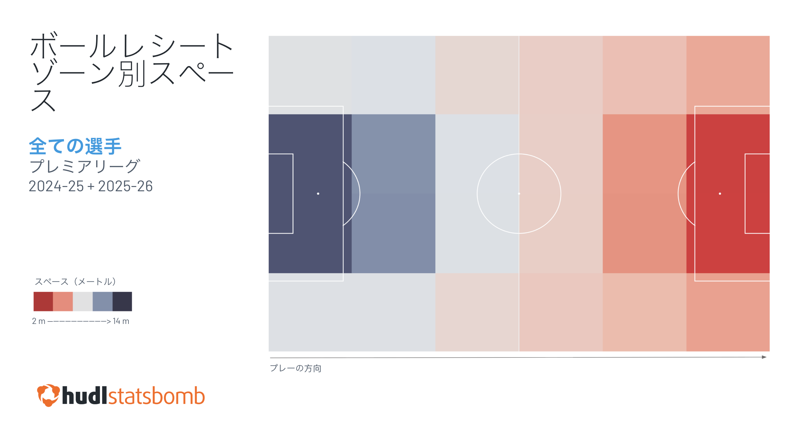 当社の Statsbomb 360 データは、選手がより後方でボールを受けるほど、一般的にプレーするためのスペースが増えるという仮定を裏付けています(灰色系はより多くのスペース、赤色系はより少ないスペースを示します):