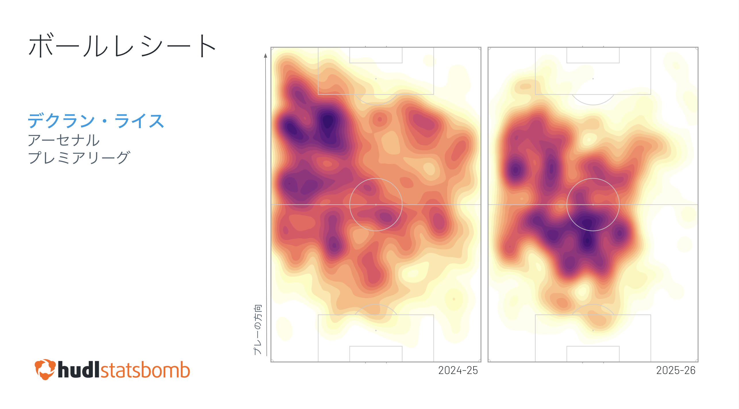 そして、今季と昨季のライスのボール受領位置をマッピングすると、彼がより頻繁にスペースの多いエリアでボールを受けていることがすぐに分かります。実際、自陣のセントラルコリドー(中央の通路)に絞って見ると、そのゾーンでのボール受領の総割合は、昨シーズンの24%から今シーズンは39%に増加しています。
