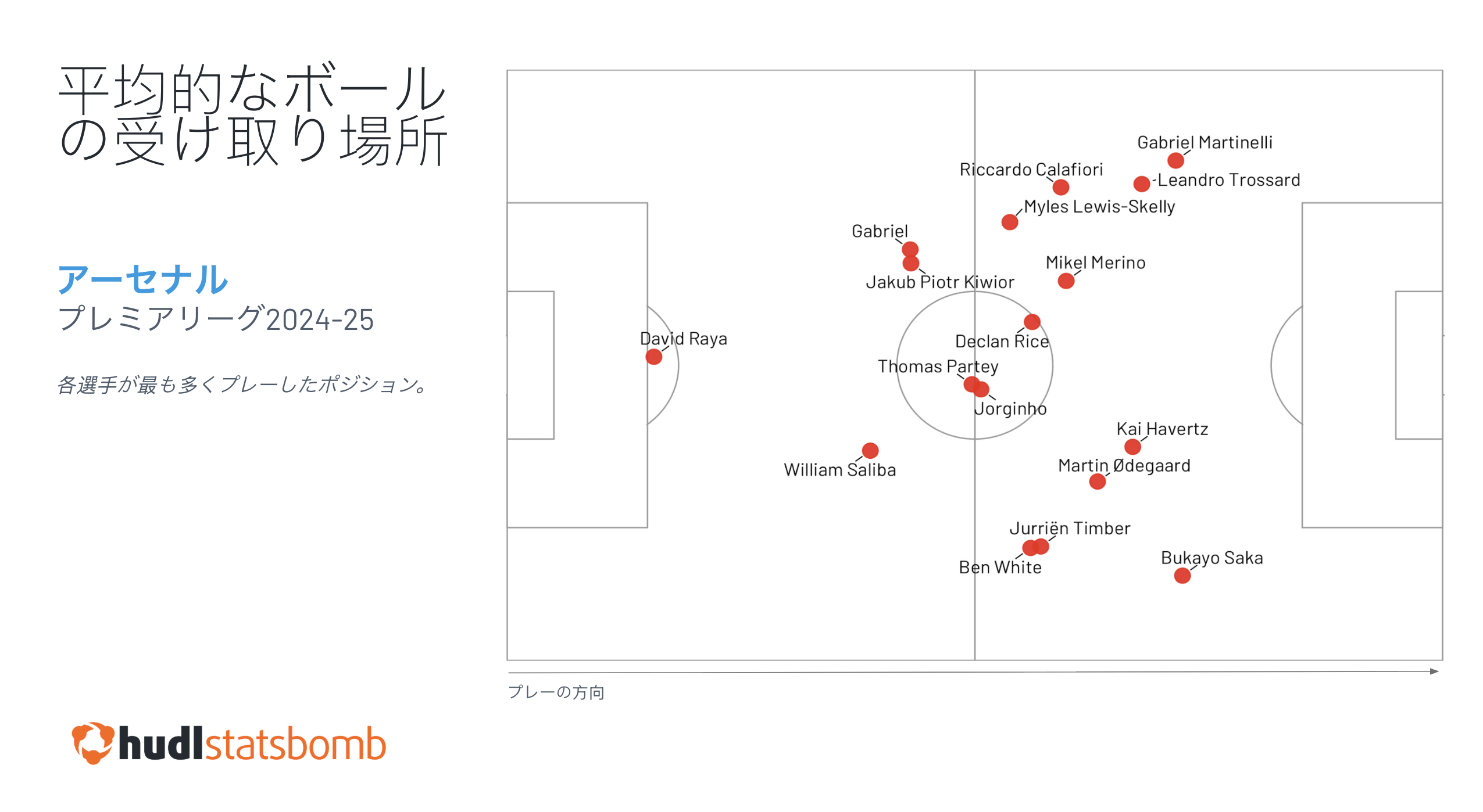 アーセナルは、3人目のミッドフィールダーがどれだけ高く中央に位置するかによって、4-3-3と4-2-3-1のフォーメーション間を移行し続けています。しかし、一般的にライスと夏に加入したマルティン・スビメンディ(Martín Zubimendi)は、昨シーズンのライスとトーマス・パーティ(Thomas Partey)よりも明確なダブル・ピボットを形成していることが分かります。