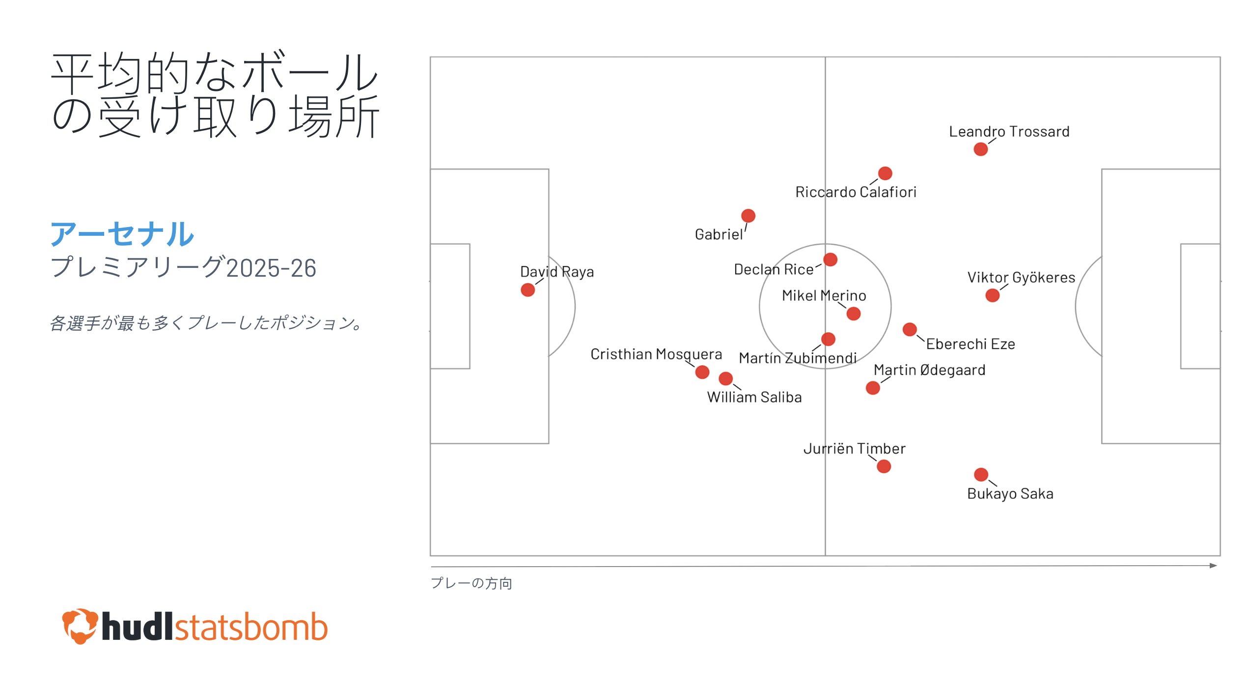 昨シーズンのアーセナル選手の平均ボール受領位置を、各選手が最も頻繁に占めたポジションに絞って見てみると…