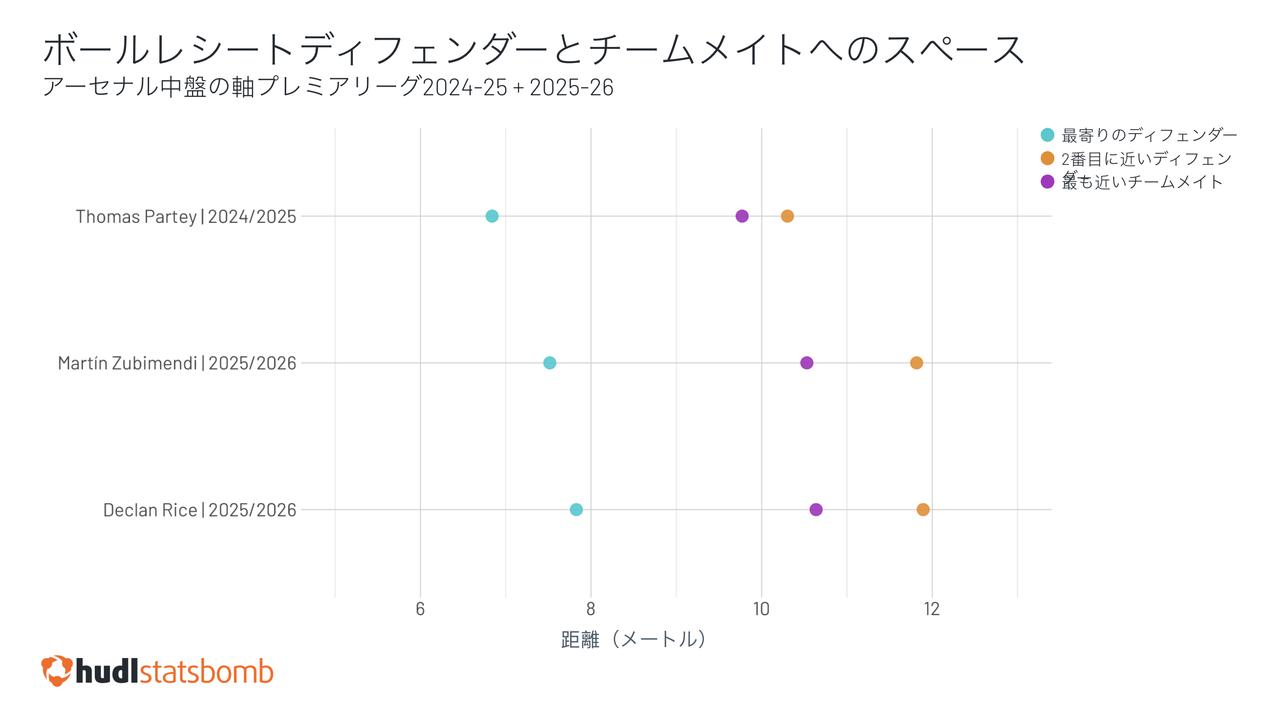 それは間違いなく、彼がボールを受ける際のスペースの増加に貢献しています。ライスはボール受領時に平均7.82メートルのスペースを周囲に確保しており、これはウェストハムでのラストから2番目のシーズン以降で最も広く、昨シーズンよりも約1メートル広くなっています。