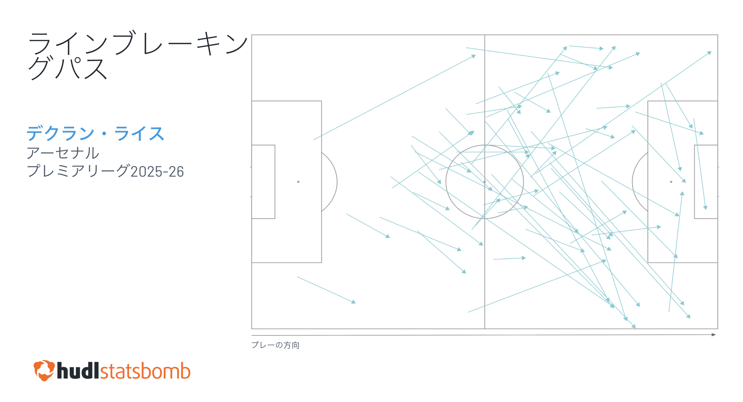 前述の通り、ライスの個人的な貢献は90分あたり5.31回のライン・ブレイキング・パスに増加しており、これはシーズン比で約40%の増加です。