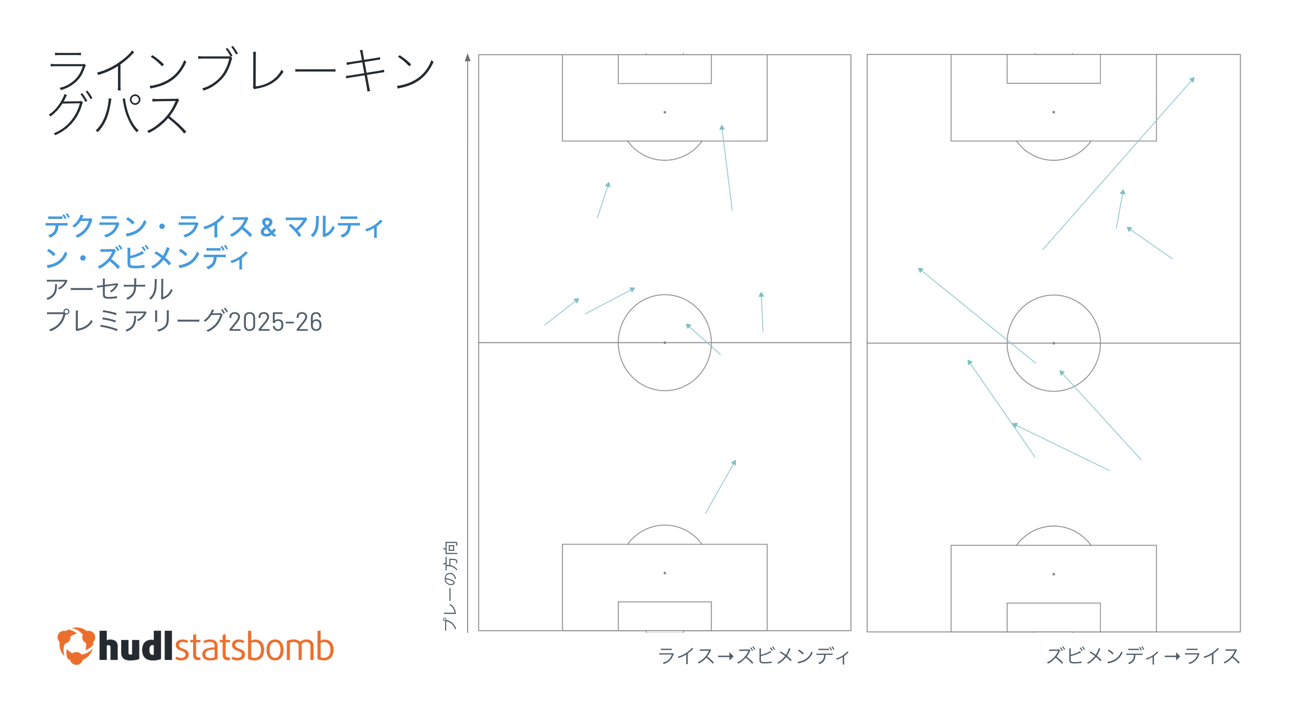 プログレッシブ・パス(ボール前進パス)も同様の傾向を示しています。今シーズンのチームのライン・ブレイキング・パスの27%をライスとスビメンディが占めており、これは昨シーズンのパーティとライスによる22%の貢献度と比較して増加しています。