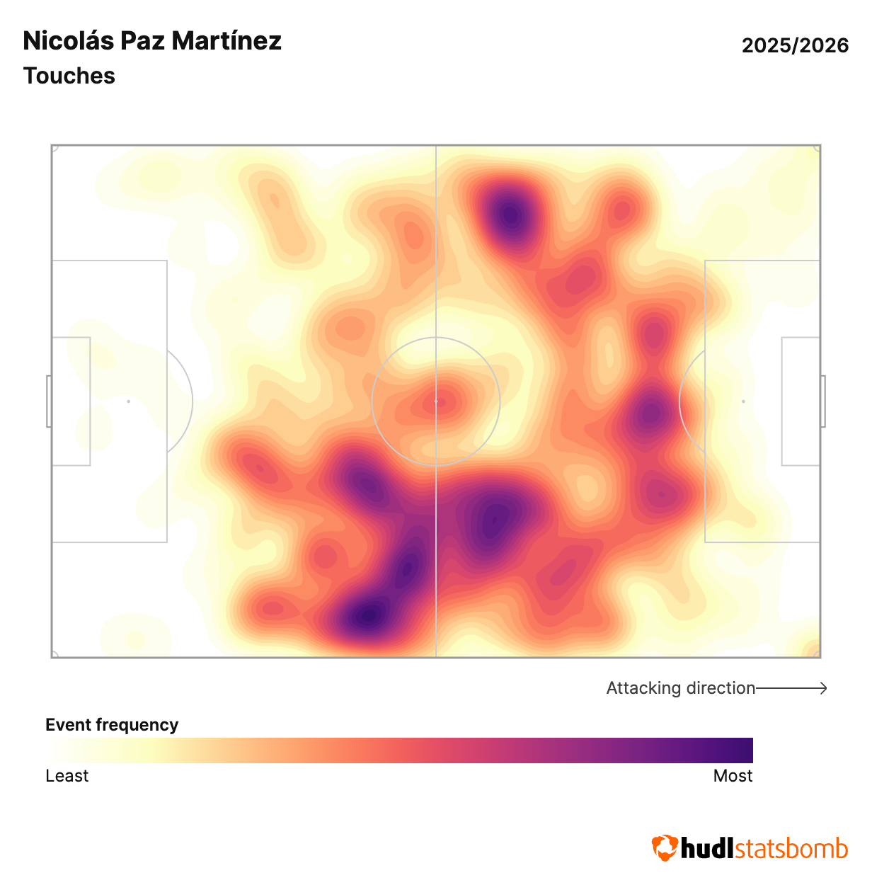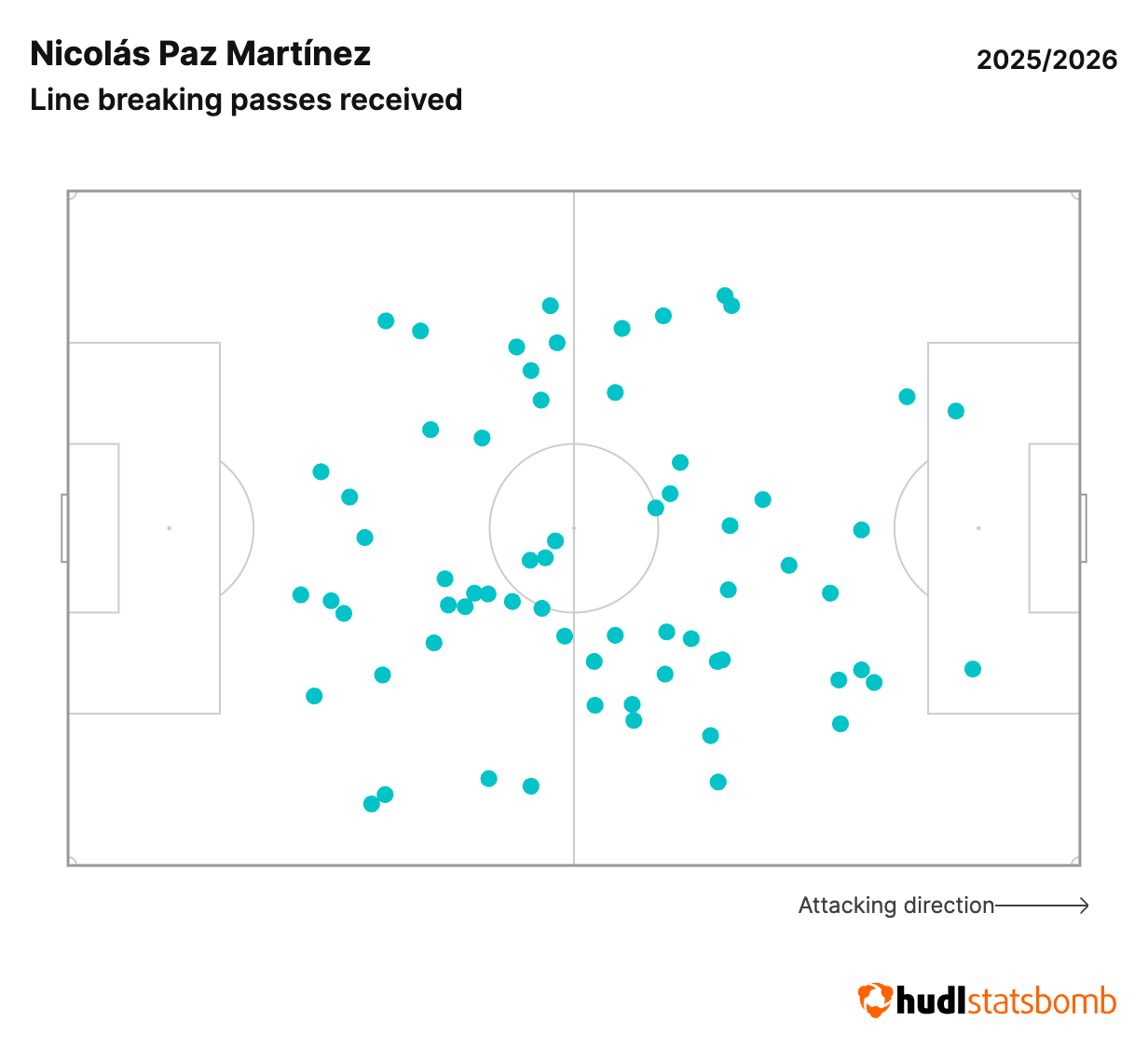 Nico Paz is left-footed, so by dropping into that right-central area, on his inverted side, once he turns he can see the whole pitch in front of him and open up every possible option.